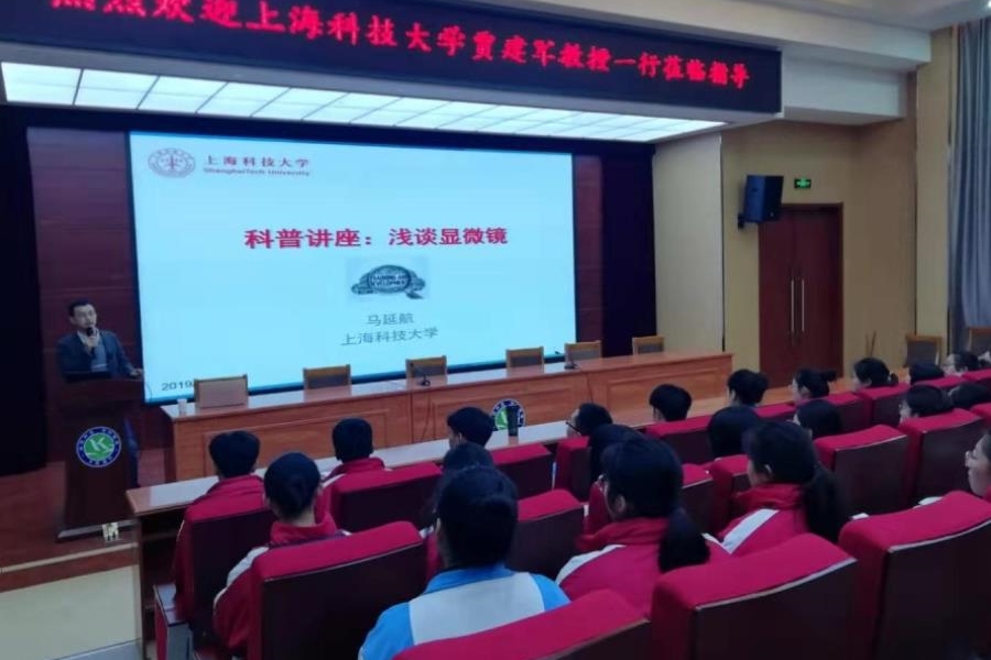 2019年11月23日晚上,上海科技大学贾建军教授一行两人,莅临我校进行科普知识讲座和宣传活动。开封高中信息与资源管理处主任周金陈进行了热情的接待工作。 晚上六点三十分,在开封高中东报告厅,上海科技大学物理学院教授、研究员马延航向开高学子和家长做了题为“浅谈显微镜”的科普知识讲座。通过对显微镜的作用及发展历程的介绍,使在场的学生和家长对显微镜有了更深的了解。随后,上海科技大学创业与管理学院贾