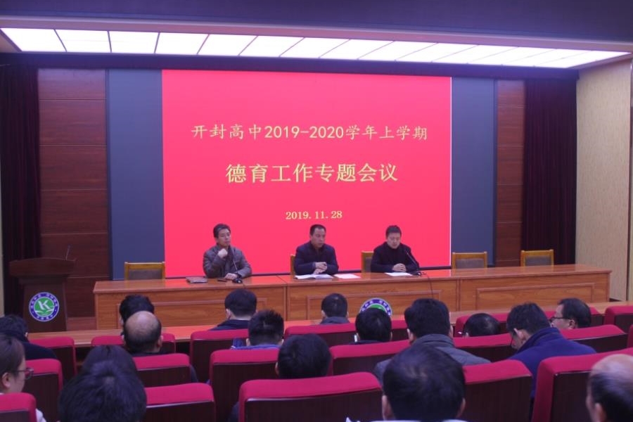 2019年11月28日下午,开封高中东校区在报告厅召开2019-2020学年上学期德育工作会议。校长顾伯宇、副校长李振华、学生处主任苗森、学生处副主任娄渊中和三个年级的全体班主任参加了会议。会议由学生处主任苗森主持。顾伯宇校长在会议上强调了德育工作在学校教育教学管理中的重要作用,明确在班主任工作中要有爱国、安全和规范的意识,指出班主任要有终身学习的精神,加强交流沟通,共同成长和进步。娄渊中副主任总