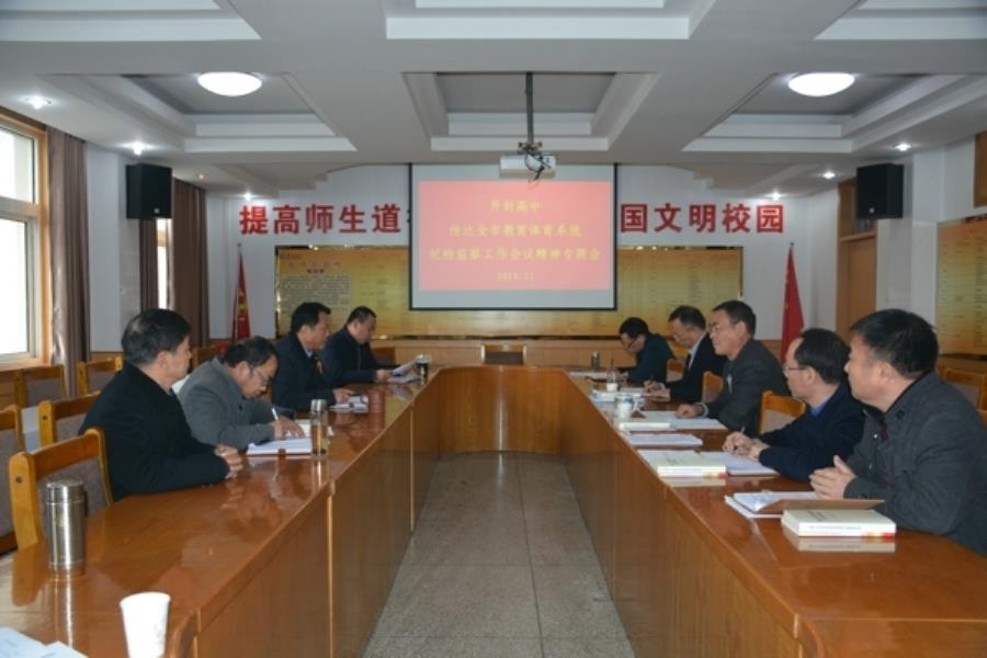 2019年11月22日,开封高中在三楼会议室召开传达全市教育体育系统纪检监察工作会议精神专题会,会议由开封高中党委书记耿振勇主持。在会上,党委纪检委员李振华向与会人员传达了全市教育体育系统纪检监察工作会议主要精神,并带领学习中共开封市纪委、开封市监察局印发的《关于严格规范党和国家工作人员操办婚丧喜庆等事宜的暂行规定》。党委书记耿振勇指出,各部门要召开相关会议,将上级要求传达至每位教职工。全体教职工