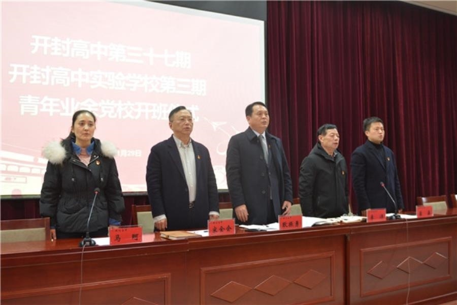 2019年11月29日,开封高中第三十七期(开封高中实验学校第三期)青年学生业余党校开班仪式在报告厅隆重举行。开封高中党委书记耿振勇,校党委委员、副校长宋全会,校务委员李沛,校学生支部书记、学生处主任、校团委书记苗森,西校区行政党支部支部书记、综合办副主任马珂在前台就坐,高三年级135名党校学员及高一、高二年级各班团支书、班长等班干部参加了开班仪式,仪式由马珂主持。仪式在庄严的国歌声中开始,首先由苗森向大家