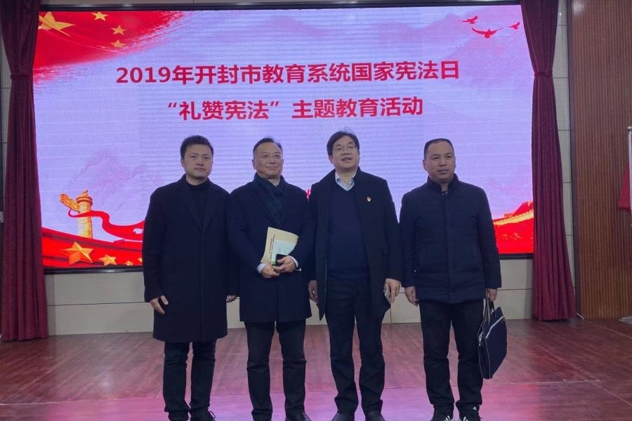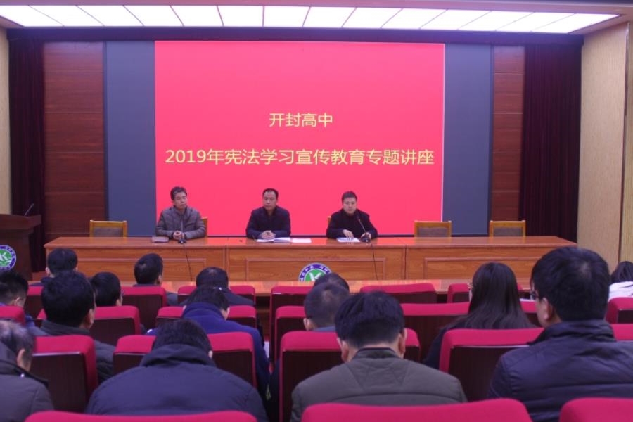 12月4日是我国第六个国家宪法日,也是我国第二个宪法宣传周,为了响应深入贯彻落实习近平总书记全面依法治国新理念、新思想、新战略,深入贯彻落实上级关于深入学习宣传和贯彻实施宪法的部署,开封市教育系统于当日上午在集英中学多功能报告厅组织开展2019年“礼赞宪法”主题教育活动。开封高中副校长宋全会、副校长李振华、学生处主任苗森、西校区综合办副主任王文昊参加了会议。 会议通过多媒体大屏幕与教育部组织开展