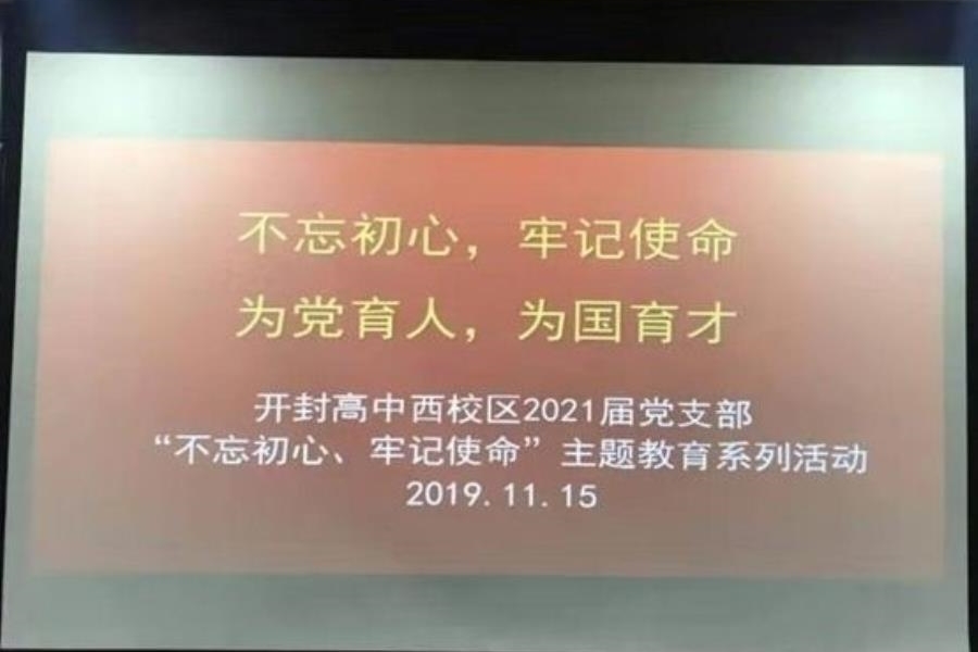 为贯彻落实上级“不忘初心、牢记使命”主题教育工作要求,按照开封高中“不忘初心、牢记使命”主题教育系列工作安排,提升年级党员教师的理论素养,强化为党育人、为国育才的思想认识,11月15日下午,开封高中西校区2021届党支部在办公楼三楼会议室开展“不忘初心、牢记使命”主题教育集体封闭学习活动。开封高中党委副书记、校长顾伯宇,党委委员、副校长尚嘉伟出席会议,党支部书记、年级主任张辰贝,宣传委员、工会副主