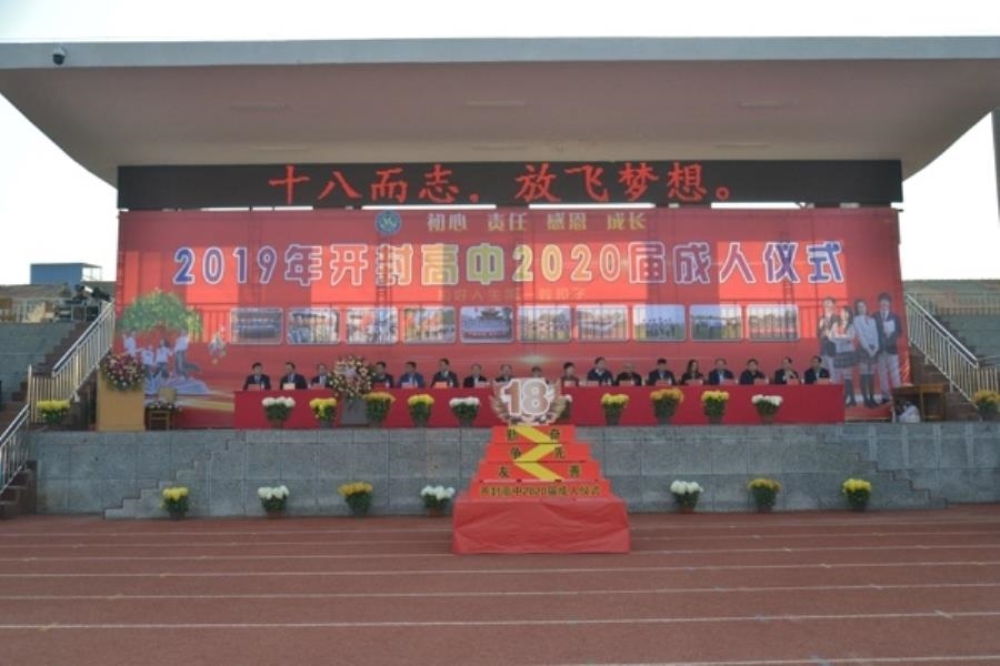 在丰收的秋色时光里,10月20日,开封高中洋溢着一派喜庆的气氛,彩球高挂、红旗飘飘、十八岁成人主题墙和签名墙随处可见,象征彩色梦想的彩虹成人门高高耸立,精心布置的主席台上鲜花锦簇,两扇巨幕屏滚动播放着同学们高中生活的过往以及20届全体教师、开高校友们的祝福。开封高中2020届成人仪式在我校东校区隆重举行。在学校开阔的操场上,我校2020届万千家长及老师怀着无比激动的心情齐聚于此,共同见证孩子成长过