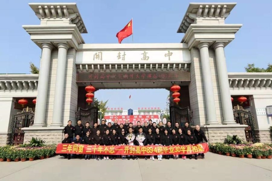 金风送秋爽,汴城飘菊香,开封高中894班毕业30周年庆典活动于2019年10月19日在开封高中报告厅隆重举行。开封高中校长顾伯宇老师、开封高中原校长常跃进老师、物理教研组王新房老师应邀和参会同学共30多人参加了本次活动。10月19日上午9:50分,开封高中894班参会师生在开高报告厅济济一堂,召开了一次别开生面、庄重而又热烈的主题班会。顾伯宇老师代表开封高中发表了热情洋溢的致辞:对同学们到母校举办