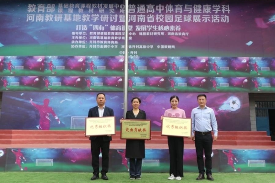 查看详情9月20日下午,由河南省教育厅主办,河南省教育厅基础教研室、开封市教育体育局承办的全国普通高中体育与健康学科河南教研基地教学研讨暨河南校园足球教学展示活动在开封市金明中小学落下帷幕。两日来,来自浙江、重庆、北京、广东、福建、安徽等省市的体育教研员和教学专家,全省各市,直管县的体育教研员、骨干教师共800余人,共同观摩了20余节不同教材,不同水平段的现场体育课。全国体育教学专家们全面深入点评每节课,