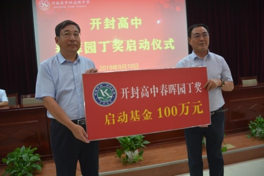 9月10日,我市教育工作者喜迎第35个教师节。对于我校全体教职工来说,“春晖园丁奖”的设立更是今年教师节收到的最好的礼物。本着助力教育、尊师重教的美好愿望,今年教师节当日,开封高中86届校友杨国胜、开封金控投资集团有限公司各捐资100万元,作为启动基金,在我校设立“春晖园丁奖”,每年利用受益奖励为学校发展做出突出贡献的教职工。9月10日下午15时,在西校区报告厅举行的“春晖园丁奖”启动仪式现场,见
