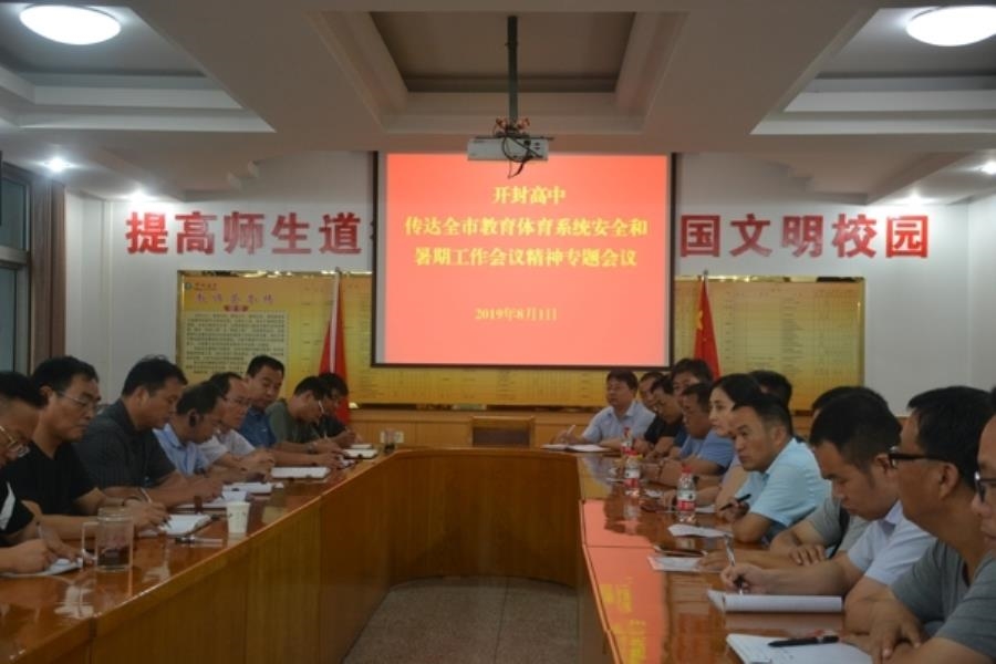 8月1日下午,开封高中在办公楼三楼会议室召开传达全市教育体育系统安全和暑期工作会议精神专题会议,开封高中领导班子全体成员、各处室主任和年级主任参加了会议,会议由副校长刘培兵主持。会上,刘培兵传达了市教育体育局会议安全和暑期工作会议精神。刘培兵指出,7月31日下午,市教育体育局召开了安全和暑期工作专题会议。会议总结了近段时间教育体育系统的安全工作,会议强调,一是要夯实安全规章制度,筑牢校园安全防范体