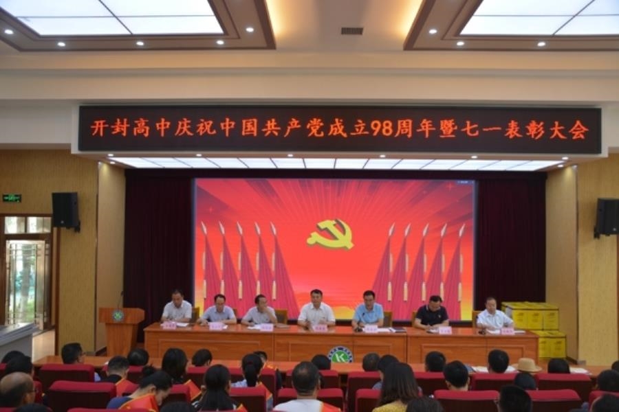 2019年6月30日上午8时30分,开封高中庆祝中国共产党成立98周年暨七一表彰大会在东校区报告厅隆重举行,会议由校长顾伯宇主持。全体党员在副校长宋全会的带领下重温入党誓词,全体党员的铮铮誓言响彻整个报告厅,充分表明了坚定的共产主义信念。会议对2018—2019学年度先进党支部、2018年度优秀共产党员和学习强国学习先进集体、先进个人进行了表彰,先进党支部支部书记代表黄涛、优秀共产党员代表张玥、学