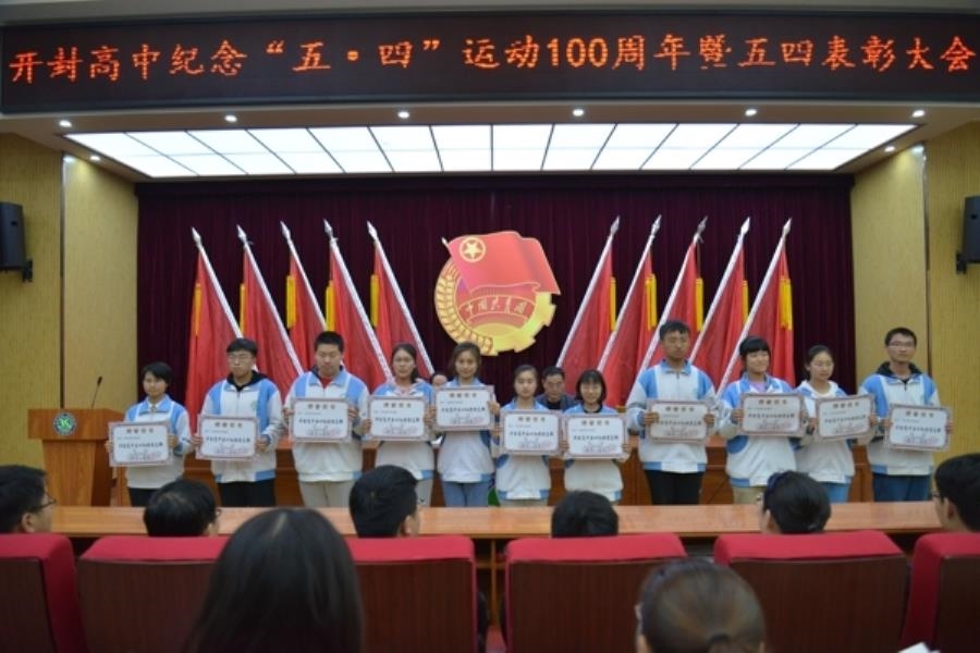 2019年4月25日,为纪念“五四”运动100周年,庆祝年青人自己的节日,我校召开2019年“五四”表彰大会,表彰我校优秀个人和先进集体。各支部团员学生代表、五四青年之星教师集体参会,校长顾伯宇、副校长马分产、副校长刘培兵、校务委员尚嘉伟出席本次大会。会议由校团委书记苗森主持。会议在威武庄严的国歌中开始。随后,马分产宣读《关于表彰2018年度开封高中先进团组织和个人的决定》,东校区1902团支部等