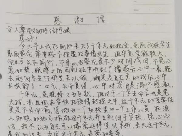 廉者,民之表也;真者,精诚之至也。开封高中保洁阿姨刘秀梅用自己的善行诠释了“拾金不昧,精诚动人”的深刻内涵。12月5日上午,开封高中保洁阿姨像刘秀梅往常一样在学校卫生间打扫卫生,清扫的时候偶然发现卫生间有一沓现金,刘秀梅没有丝毫犹豫,直接将钱交给了值班领导。有一种幸福叫失而复得,丢钱的同学听到了广播中播出的招领启事,领回了丢失的1100元,并且写信向保洁阿姨表达了自己的感激之情。拾金不昧自古以来就