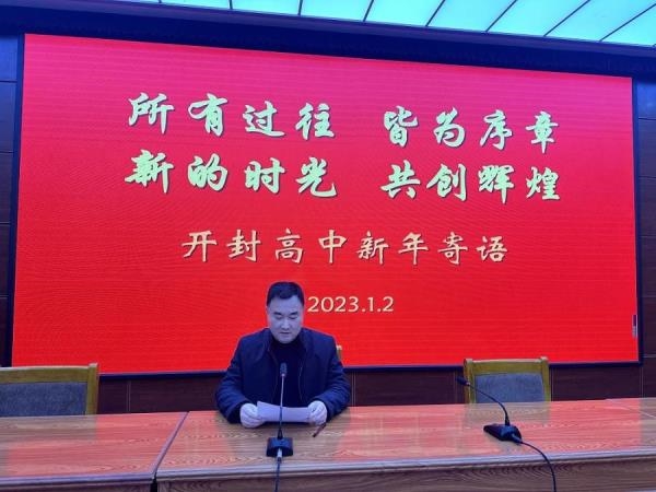 虎振雄风扬正气,兔续华章启新征。2023年新年伊始,开封高中副校长尚嘉伟代表学校对全体师生发表新年寄语。尚嘉伟回顾了刚刚过去的2022年。他讲到,2022年是历史长河中再普通不过的一瞬间,但是因为我们遭遇了新冠疫情的肆虐,又使这一年显得极其不平凡。这一年,我们奋力追梦不停歇,工作、学习和生活扎扎实实;这一年,我们隆重举行了120周年校庆活动,赓续百廿名校优良传统;这一年,我们师生齐心协力战新冠,疫
