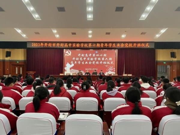 2023年1月5日,开封高中第四十期(开封高中西校区第六期)青年学生业余党校开班仪式在报告厅隆重举行。开封高中党委副书记、副校长刘培兵,开封高中党委委员、副校长张志强,学生支部书记、校团委书记苗森,行政党支部书记马珂在前台就坐,23届101名党校学员参加了开班仪式,仪式由马珂主持。开班仪式在庄严的国歌声中开始,苗森向各位学员介绍了开封高中青年学生业余党校的发展状况,马珂宣读了《开封高中青年学生业余