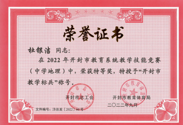 “沙场练兵,教学相长”,我校教师在市总工会、市教育体育局组织的教育系统2022年度教学技能竞赛活动中再次取得优异成绩:我校教师杜银洁、王培育荣获2022年度教学技能竞赛市级特等奖;董莹波、张亚婷、纪婷婷、田盼盼、曹路摇、郝超男、李秀娟七位教师荣获2022年度教学技能竞赛市级一等奖。根据文件精神,特等奖获得者杜银洁、王培育两位老师将按程序申报授予开封市“五一劳动奖章”,同时获奖的九位教师被授予“开封
