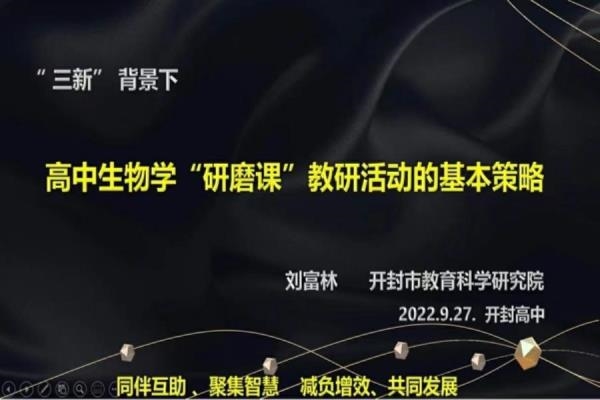 为了深入贯彻落实党的十九大精神,造就党和人民满意的高素质专业化创新型教师队伍,落实立德树人根本任务,在市教体局和市教研室的指导下,开封高中生物组在“一天一研”校本教研的基础上,开展常态化“研课、磨课”教研活动,并在市教研时进行了展示。因疫情防控要求,原定于2022年9月27日的开封市高中生物学科"三新”背景下的研磨课主题教研活动在线上进行。我校生物组在录播室进行本次教研活动。其教研内容包