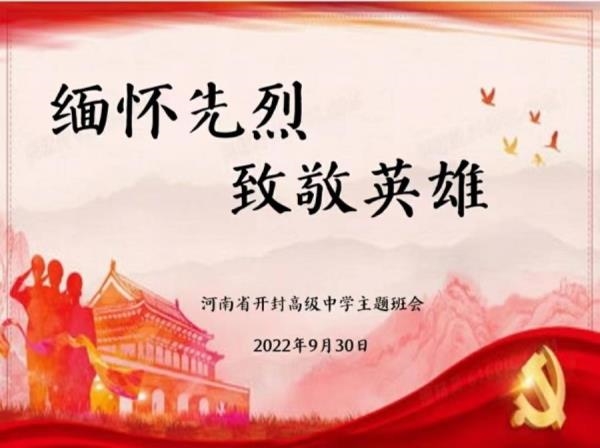 今天是2022年9月30日。第十二届全国人民代表大会常务委员会,第十次会议设立每年的9月30日为烈士纪念日。 开封高中召开“缅怀先烈 致敬英雄”主题班会。学生处副主任张辰贝进行了主题讲话。他教育同学们,因为有了无数的先烈,有了他们的无私、牺牲,才有了今天的和平环境,才有了祖国今天的繁荣昌盛。革命烈士抗击外敌,用自己的血肉之躯筑成保家卫国的钢铁长城,为了独立、民主、繁荣、富强的新中国而浴血奋战。时间