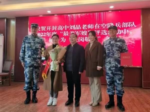 刘晶,女,汉族,1985年出生,中共党员,现任河南省开封高级中学教师,丈夫是空降兵部队一名基层政治教导员。为了支持丈夫工作,她十年来义无反顾承担起赡养父母、抚养女儿的重担,并在自己的工作岗位上创造了不俗的成绩,展示了新时代军嫂的精神风貌,今年被空降兵军表彰为“最美军嫂”。军旅缘结下军旅情。刘晶的父亲曾是一名军人,后来转业到地方公安系统工作。因为工作性质,父亲值班备勤经常不在家,母亲还要定期上夜班,