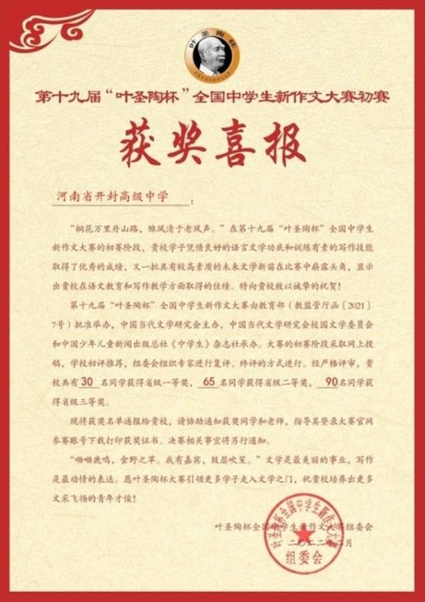 试纸浸墨香,金笔下千言。桃李风华茂,夺冠展风骚。由教育部批准、中国当代文学研究会主办的第十九届“叶圣陶杯”全国中学生新作文大赛决赛近日揭晓,开封高中参赛学生在老师们的指导下,凭借良好的语言文学功底和训练有素的写作技能,经过初赛和决赛两轮鏖战,在全国77万份作文中以极大的优势胜出。其中国家级一等奖3名,国家级二等奖4名,国家级三等奖4名,另有省级一等奖30名,省级二等奖65名,省级三等奖90名,共计