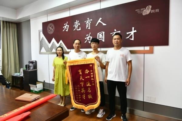 8月8日上午,我校2022届毕业生尹奥在父母的陪同下前往开封高中为学校赠送锦旗,以此表达对学校、对老师由衷的感激和真诚的祝愿。副校长马分产、办公室主任李建威、2022届年级主任黄涛以及2201班任课教师张伟善、杨洪慧、张莉莎、崔亚奇一起见证了这一温馨时刻,并为学子送上祝福。星光不问赶路人,岁月不负有心人。尹奥同学自2019年进入开封高中以来,敬爱师长,勤奋刻苦,深受各位老师和同学喜爱。三年时光,师