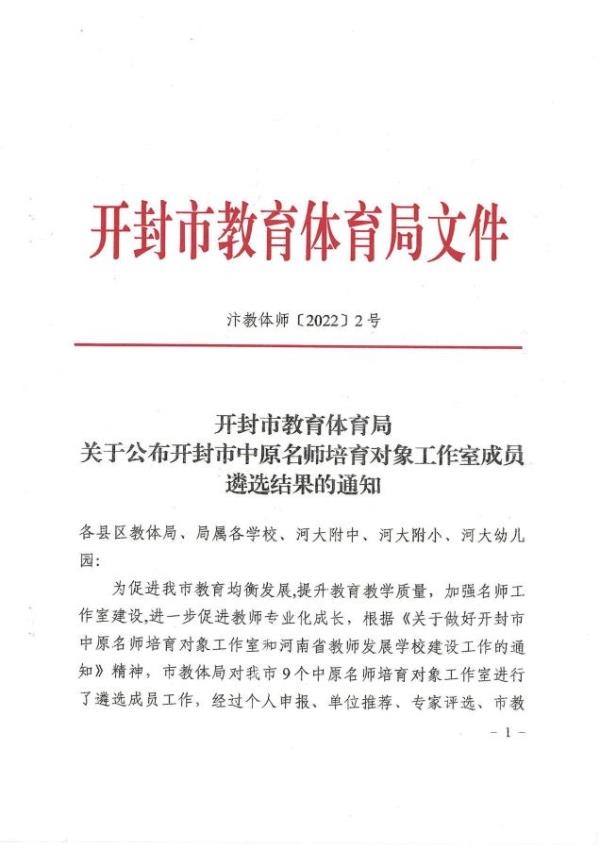 为促进开封市教育均衡发展,提升教育教学质量,加强名师工作室建设,进一步促进教师专业化成长,根据《关于做好开封市中原名师培育对象工作室和河南省教师发展学校建设工作的通知》精神,近期开封市教育体育局完成了中原名师培育对象工作室成员遴选工作。
