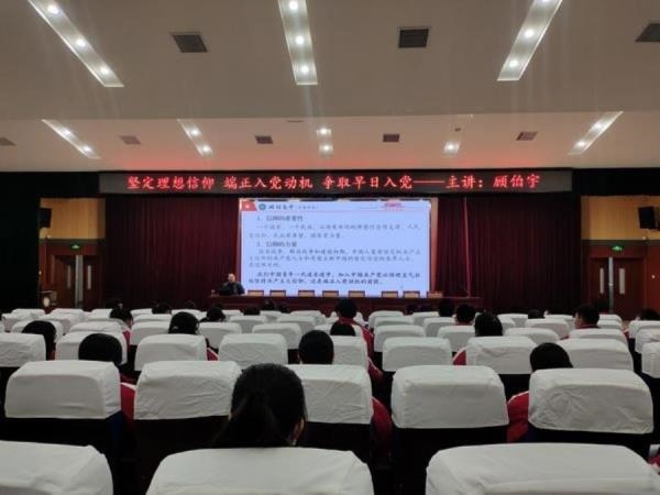 12月23日,开封高中党委书记顾伯宇为学校第五期青年学生业余党校学员做了题为《坚定理想信仰 端正入党动机 争取早日入党》的党史学习专题讲座。顾书记向同学介绍了全国党员概况,他表示一个国家,一个民族,必须有共同的理想信念作支撑。人民有信仰,民族有希望,国家有力量。从爱国英雄杨靖宇、吉鸿昌,革命烈士黄继光、刘胡兰、江姐等的故事,到建国初期华罗庚、钱学森毅然回国,再到和平时期雷锋、焦裕禄等诸多优秀共