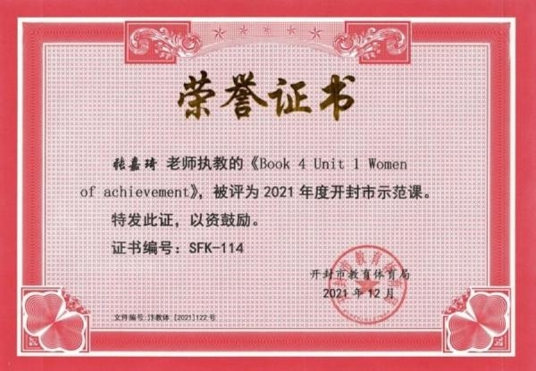 为推动开封市优秀教育科研成果的转化应用,激发广大教师将教育科学研究优秀成果运用到课堂教学实践中的积极性,促进教育教学质量的提高,开封市教育科学研究所举行了2021年度开封市课题示范课评选活动。我校英语学科教师张嘉琦、化学学科教师刘晓琳分别代表所在课题组参评,并取得佳绩,为我校赢得了荣誉。