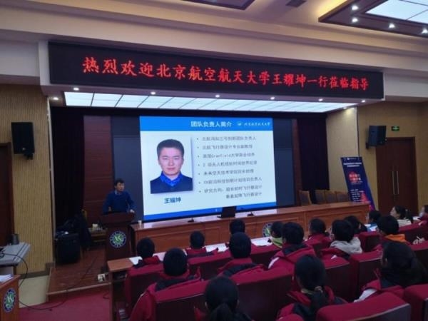 在喜迎我校120年校庆之际,北京航空航天大学教授王耀坤、北航河南省招生负责人潘风行老师,南方科技大学河南招生负责人徐森邈老师莅临我校,进行科普讲座及高校宣传。我校校务委员王新国,教务处主任周金陈,学生处副主任张辰贝进行了热情的接待。12月28日下午,在学校东报告厅,学生座无虚席等待聆听专家讲座。本次王耀坤教授为我们带来的是“冯如三号”无人机的科普知识讲座。“冯如三号”先后两次创下世界纪录, 为共和