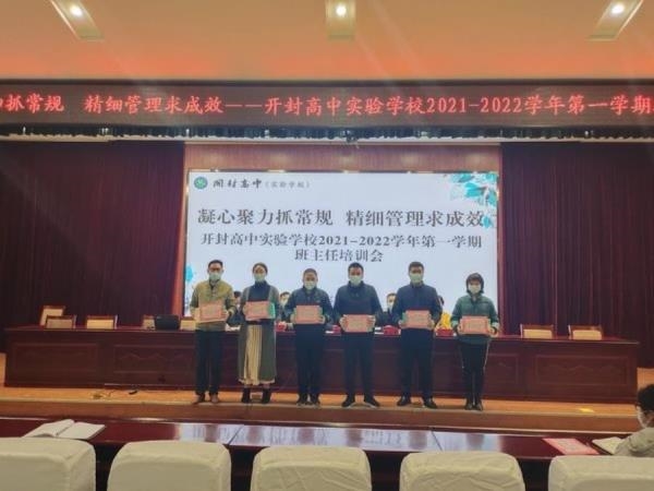 为提升班主任专业化水平,加强班主任队伍建设,11月11日下午,我校在报告厅召开了《凝心聚力抓常规 精细管理求成效》2021-2022学年第一学期班主任培训会。开封高中副校长刘培兵、张志强,校务委员李沛,学生处副主任王文昊、高彦磊及全体班主任参加了本次会议。会议由学生处主任马珂主持。刘培兵宣读开了《开封高中实验学校关于表彰2021年班主任德育案例评选优秀案例的决定》,学校领导向获奖班主任颁发了证书及