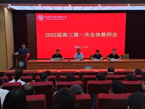 7月12日下午,开封高中举行了2022届高三第一次全体教师会。本次会议由2022届年级副主任张伟善老师主持,2022届蹲点校长李振华、蹲点主任吴杰、教务处主任周金陈、年级主任黄涛和2022届全体高三任教老师参与。会议过程中,吴杰、黄涛、周金陈、李振华分别从年级工作、教师工作、教学安排、学校工作四方面对下一阶段教育教学工作进行明确安排。吴杰在把握高考试卷特点的基础上指出高三阶段应从基础做起,按照学校