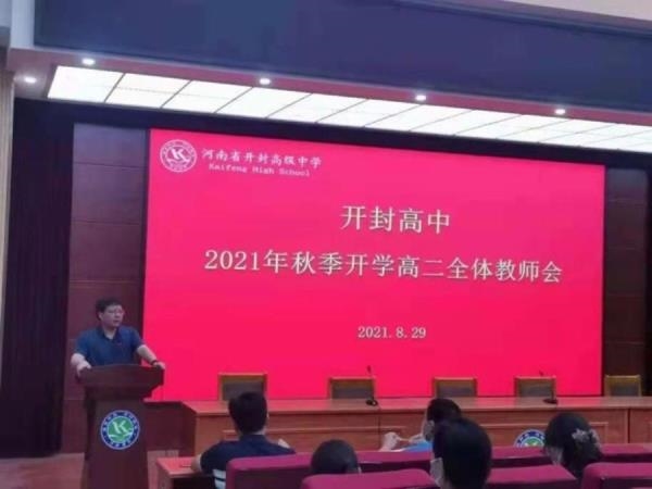 8月29日上午,开封高中东校区召开2021年秋季高二教师全体会,会议在西报告厅举行。周金陈主任首先对本学期的教学工作计划进行了安排部署。在接下来开学的网课上学中,教师在教学中要注重引导,