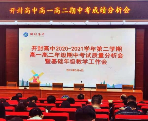 开封高中东校区于5月6日下午,在东报告厅召开高一、高二年级期中考试质量分析会暨基础年级教学工作会,会议由教务处主任周金陈主持,副校长乔国颖、李振华,校务委员荣海洋,师训处主任毛广文,督导室主任苏新明及高一高二全体老师参加会议。