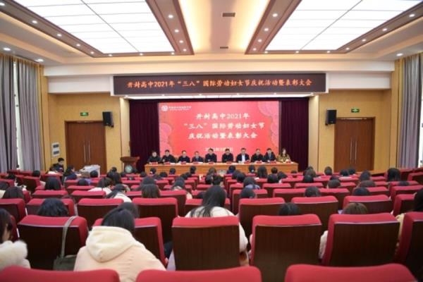 为庆祝2021年“三八”国际劳动妇女节,表彰女教工在学校发展中作出的突出贡献,开封高中于3月8日下午在报告厅隆重召开庆祝“三八”国际劳动妇女节暨表彰大会,全校女教工欢聚一堂,共同庆祝自己的节日。学校党委书记耿振勇,校长顾伯宇,副校长乔国颖、宋全会、马分产、李振华,工会主席李沛,团委书记苗森,工会副主席马珂出席会议。会议由副校长尚嘉伟主持。学校团委书记苗森代表广大青年团员向全体女教工送上了美好的祝福