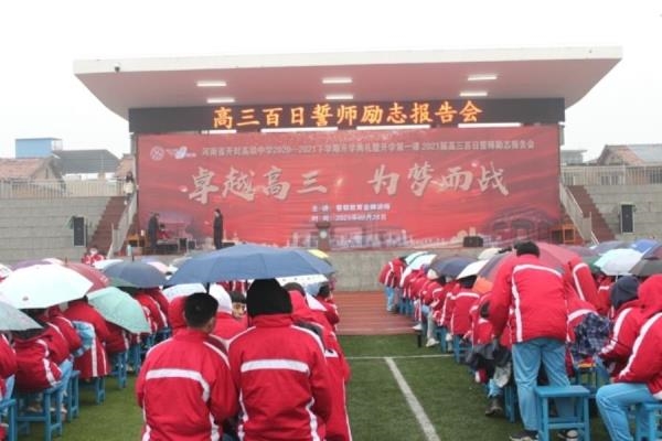 绵绵春雨贵如金,转瞬枯木披绿荫。2月28日上午,开学典礼结束之后,开封高中东校区高三学生在如丝细雨中参加开封高中开学第一课——2021届“高三百日誓师励志报告会”。大会由学生处主任苗森主持。首先,由学校国旗护卫队进行升旗仪式,国旗、校旗以及2021届年级段段旗在开高上空分别升起,随后高三蹲点校长马分产同志发表了热情洋溢的致辞,希望同学们在最关键的时刻把知识梳理的更加完整,把应试的能力提高到高中三年