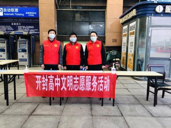 春运期间,开封火车站是开封市疫情防控的重点部位之一。2月10日(农历腊月二十九)上午,开封高中校务委员荣海洋、学生处副主任张辰贝、年级主任吴杰一同到开封火车站,为返汴来汴旅客进行志愿服务。在出站口,他们与火车站工作人员无缝配合,引导旅客合理分流,指导旅客操作手机扫描行程二维码,检查旅客的核酸检测结果。对待旅客既热情友好又坚持原则,既很好地履行了疫情防控的职责,又为我市的志愿者服务增添了靓丽的一笔。