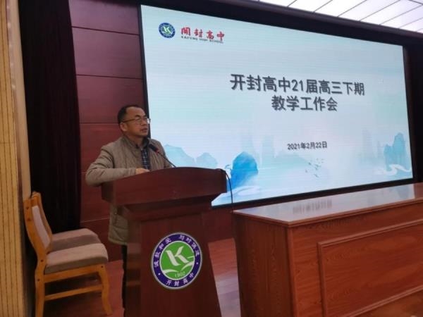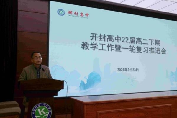 我校于2021年2月23日上午,在东报告厅召开22届高二下期教学工作暨一轮复习推进会。会议由教务处主任周金陈主持,开封高中副校长乔国颖、学生处主任苗森和高二全体教师参会。