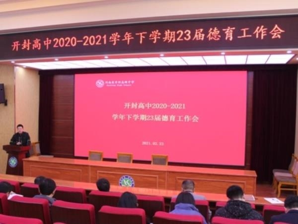 2月23日下午4点,开封高中在东报告厅召开了2020-2021学年下学期23届德育工作会。学生处主任苗森,副主任张辰贝,2023届年级主任赵向东,年级副主任王海动及各班班主任参与会议。会议由学生处主任苗森主持。首先,学生处主任苗森对学生新学期入校工作安排进行部署,并指出在下阶段教学工作中要深化班级管理,加强班级德育教育,推进班级班风建设,将班主任管理工作推向新的台阶。之后,学生处副主任张辰贝回顾了