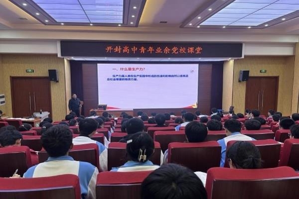 11月27日下午,开封高中东校区青年业余党校第44期第二次党课举行,校务委员荣海洋为青年业余党校学员讲授党课,主题为《以青春之力托举新质生产力的明天》。荣海洋从新质生产力的核心要义破题,结合智慧教育、芯片技术突破等实例,解析其“科创主导、效能升级”的时代特征;继而阐明青年与新质生产力的双向关联——学员既是发展成果的受益者,更将是未来的核心创造者;随后从“关注前沿、敢疑善探、实践破题、涵养品格”四个