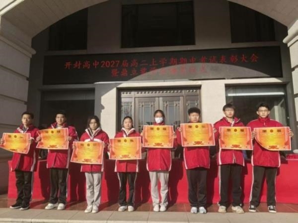冬阳暖煦滋桃李,硕果盈枝励韶华。2025年11月28日下午,开封高中办公楼广场上朝气满溢、热忱激荡,2027 届高二上期期中考试表彰大会在此隆重开幕。校领导及处室负责人与2027届全体师生齐聚一堂,共鉴荣耀时刻,共谋奋进新篇。大会由学生处副主任、2027届年级副主任朱冰峰主持,整场活动秩序井然、催人奋进,既为高二学子半程耕耘作结,更向未来征程注入磅礴动能。宣读表彰,提振士气大会伊始,教务处副主任、
