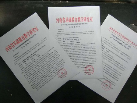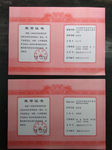 金秋正是收获的季节。近日,河南省教育厅下发了《关于公布2013—2016年度河南省基础教育教学研究项目优秀成果的通知》,我校师训处毛广文主任主持的《运用物理学史对学生进行科学方法教育的课例研究》和教务处副主任李海军主任所主持的《信息技术辅助高中数学的应用研究》两项省级课题均获得河南省优秀教育成果二等奖。