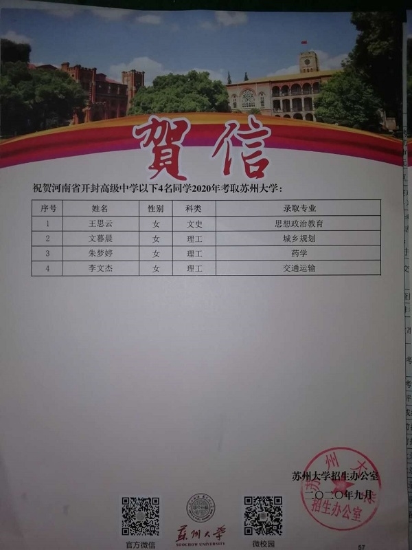在喜迎中华人民共和国成立71周年之际,苏州大学为开封高中发来贺信。感谢我校多年来为苏州大学输送了一批又一批的优质生源,感谢我校的鼎力支持、真诚相助!并祝愿开封高中各项事业更加兴旺!祝愿贵我双方友谊地久天长!祝愿全体师生家庭幸福安康!(摄影:郭玉红 审核:苏新明)