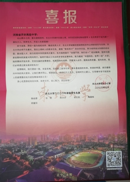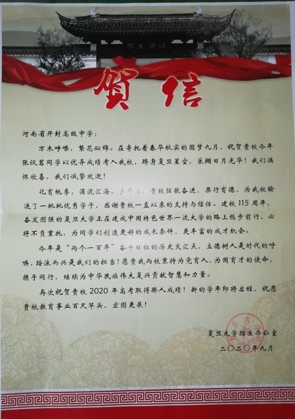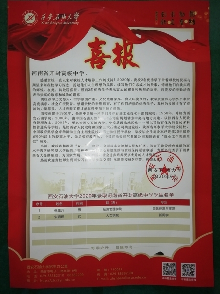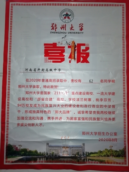 近日,我校喜讯捷报频传,复旦大学、东北大学、郑州大学、西安石油大学纷纷为我校发来喜报。祝贺开封高中众多优秀学子考入理想高校,感谢我校近年来为他们培养、输送了大批栋梁之才,祝愿我校教育事业百尺竿头,宏图更展!愿贵我两校秉持为党育人、为国育才的使命,携手同行,继续为中华民族伟大复兴贡献智慧和力量。(审核:苏新明)